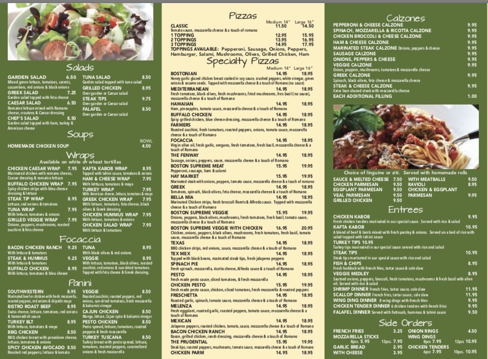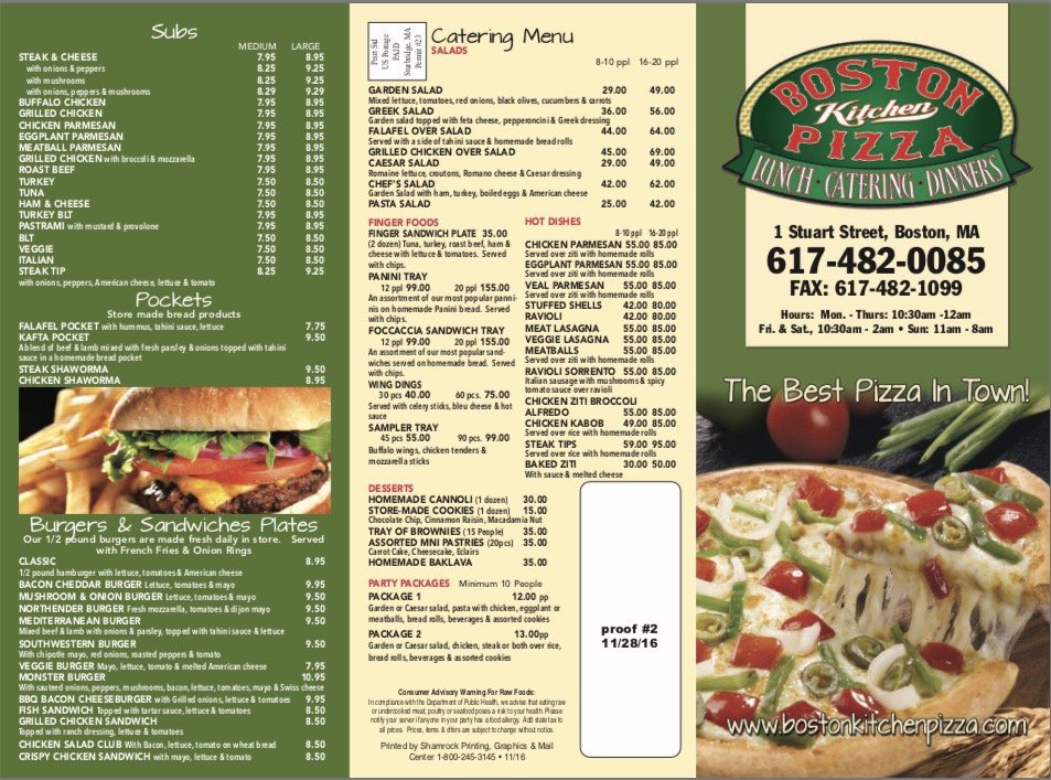 Introducing Boston Kitchen Pizza, a bustling eatery located at 1 Stuart St in Boston, MA. This Italian and burger joint offers a plethora of options for its diners- from pizzas to burgers and everything in between. With delivery and takeout options, getting your hands on their delectable dishes is a breeze. The menu boasts many vegetarian choices and caters to a variety of dietary needs. Customers rave about the fast service and tasty pizzas, with one review calling it a slice of heaven. While some noted the greasiness, the fun toppings and generous portions make it a worthwhile visit. With options for outdoor seating, private dining, and happy hour, Boston Kitchen Pizza is a versatile spot for any occasion. Don't miss out on experiencing a taste of New York-style pizza right in the heart of Boston.